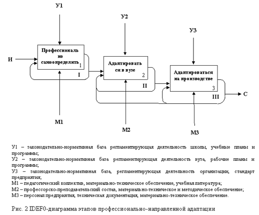 соответствии с методологией функционального моделирования IDEF0-диаграмма процесса профессионально-направленной адаптации будущих специалистов показана на рис. 1, диаграмма этапов профессионально-направленной адаптации показана на рис.2.