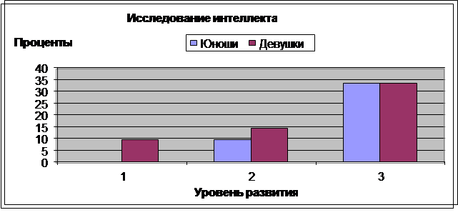 Как видно из выше приведенных данных в таблице 3.1.2 у обследуемых юношей преобладает низкий уровень развития интеллекта – 33,4%. Высокий уровень развития интеллекта не выявлен.