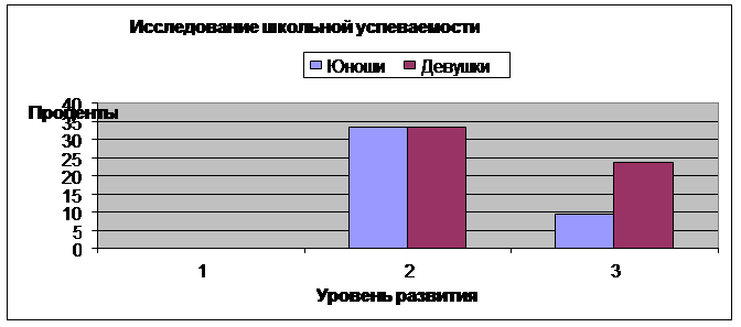 Как видно из выше приведенной таблицы 3.1.4 видно, что у юношей преобладает средний уровень школьной успеваемости – 33,4%. Высокий уровень школьной успеваемости, у обследуемых юношей, показали 9,5%. Низкий уровень школьной успеваемости, у обследуемых юношей никто не показал.