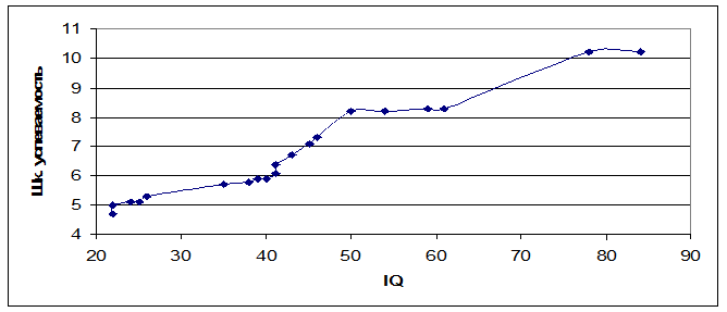Рис. 3.2.2. Корреляционная связь между уровнем интеллекта и уровнем школьной успеваемости учащихся.