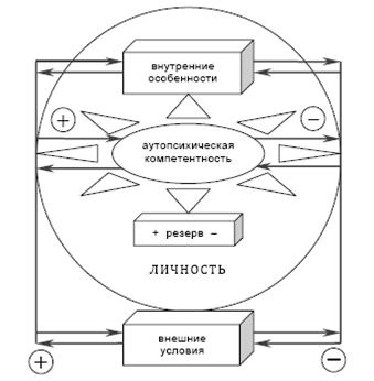 В модели представлен «резерв», способный накапливать как положительный, так и отрицательный «заряд». Но сходные ресурсные импульсы неоднозначно и даже полярно могут восприниматься личностью. Амплитуда подобных искажений зависит от аутопсихической компетентности – эффективности взаимодействия комплекса личностных качеств, позволяющих ориентироваться во внутреннем мире. Другими словами, аутопсихическая компетентность – это внешняя характеристика внутренней адекватности.