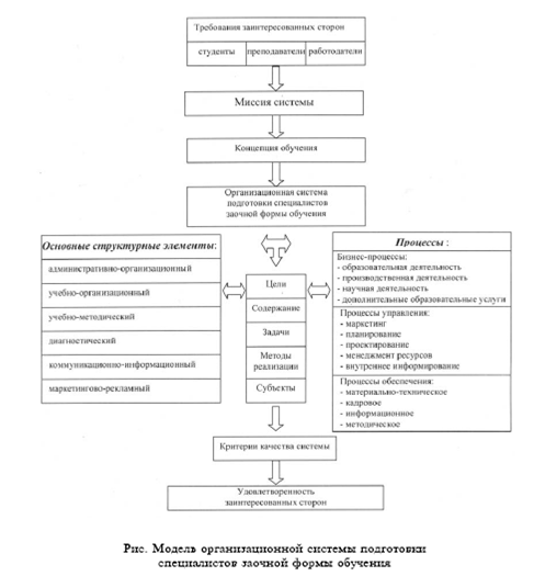2) построить модель организационной системы заочной формы обучения: определить основные структурные элементы системы, их содержание, цели, задачи;