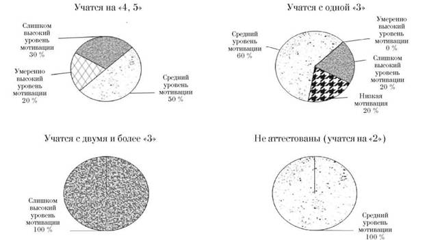 У студентов-троечников (учатся с двумя и более «3») 100 % составил слишком высокий уровень мотивации. Для людей со слишком высокой мотивацией к достижению успеха важно постоянно ставить новые, более высокие цели. При этом они предпочитают, чтобы этот успех был достигнут в условиях соревнования, то есть конкурентоспособности. Их не привлекают ситуации, при которых победа достигается за счет везения и не является личной заслугой. При этом в учебном процессе не предусмотрен личностный подход к студентам, результатом является снижение успеваемости у студентов со слишком высоким уровнем достижения к успеху.