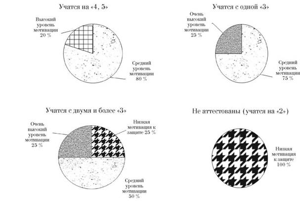 Результаты исследования говорят о том, что преобладают средний уровень мотивации к успеху и средний уровень мотивации избегания неудач. Это дает возможность повысить эффективность обучения (привлечь к участию в конференциях, факультативах, кружках, олимпиадах, семинарах), используя мотивацию к защите как гибкий инструмент.