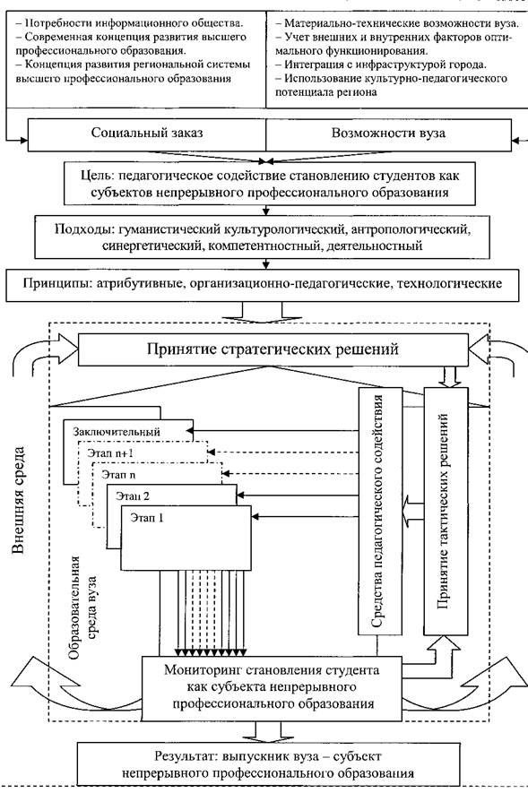 Такое построение модели дает возможность рассматривать систему педагогического содействия процессу становления студента как субъекта непрерывного профессионального образования на макроуровне как целенаправленную, а внутри - как самоорганизующуюся целостность (рис. 2).