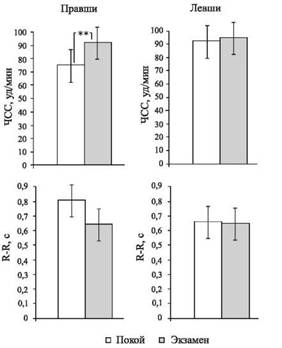 Рис. 3. Изменение частоты сердечных сокращений и длительности интервалов R-R у студентов с разными типами функциональной межполушарной асимметрии во время экзамена (** — р < 0,01)