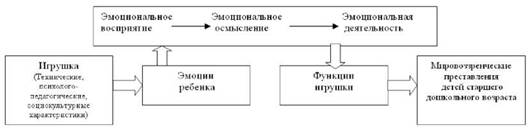 Возрастные особенности дошкольника обусловливают достаточно сильное эмоциональное восприятие игрушки, что обеспечивает быстрое и эмоционально окрашенное осмысление увиденного и побуждает к эмоционально насыщенной деятельности, в процессе которой происходит реализация всех функций игрушки: познавательной, информационной, мировоззренческой, коммуникативной, этической, эстетической, диагностической, компенсаторной, воспитательной, культурологической. Их синкретизм, обусловленный природой игрушки, позволяет обеспечить одновременное влияние на все компоненты мировоззренческих представлений старшего дошкольника. Эмоциональный фон указанной последовательности реакций ребенка сопровождает перестройку внутренней среды организма, что вызвано основной задачей возникновения эмоций у человека — адаптацией его организма к новым условиям, возникающим в пределах среды. Преобладание положительных или отрицательных эмоций проектирует направленность и готовность личности эмоционально реагировать на значимые для нее раздражители, а следовательно, и на формирование собственного отношения к окружающему миру и внешние его проявления.
