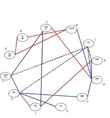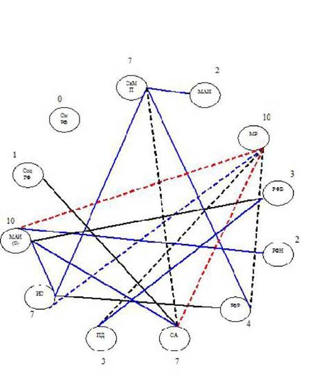 Рис. 3. Структурограмма для III группы испытуемых (средний уровень обучаемости). Обозначения те же, что на рис. 2.