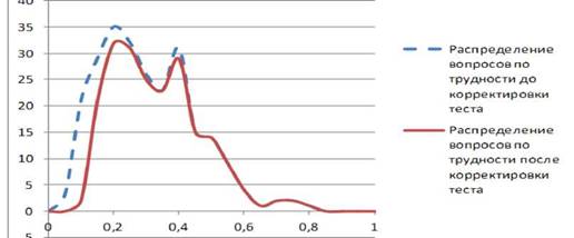 На рисунке 4 представлен скорректированный график распределения вопросов по трудности. Видна динамика изменения параметра трудности после удаления нежелательной группы вопросов: если удалить легкие вопросы, параметр трудности увеличится с 0,28 до 0,36.