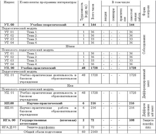 По каждому компоненту (учебно-теоретическому, учебно-практическому, научно-практическому) учебного плана интернатуры разработаны программы, методические рекомендации. Методические рекомендации по освоению учебно-теоретического компонента профессиональной подготовки служат для организации самостоятельной работы интернов: изучения заявленного в программе содержания; прохождения текущего контроля в форме тестирования и последующего, в рамках промежуточной аттестации, собеседования. Содержание учебно-теоретического компонента, отражающее проблемы современного образования, определяется выбором индивидуальной образовательной траектории подготовки в интернатуре, представляет собой теоретическое обоснование практической деятельности педагога и/или педагога-психолога. Методические рекомендации содержат примерные тестовые задания и перечень профессиональных проблем для обсуждения в рамках собеседования.