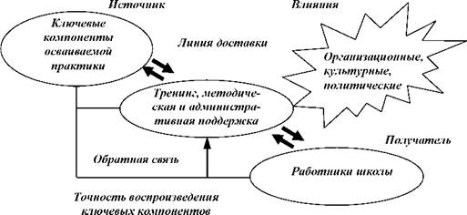 Ключевые компоненты распространения новой педагогической практики. Все, что сказано о фиксации в ЦУММ ключевых компонентов новой педагогической практики, можно отнести и к ключевым компонентам ее распространения. Распространение — тоже процесс со своими ключевыми элементами. Это позволяет уточнить концептуальную рамку распространения нововведений и предложить схему распространения ЦУММ в условиях реальных ОУ (рис. 2).