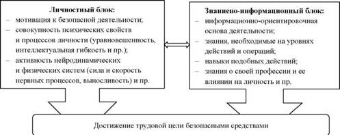 Формирование профессиональной безопасности следует строить с учетом модели безопасной деятельности, которая включает личностный и знаниево- информационный блоки. Оба блока взаимосвязаны и взаимообогащаются в процессе профессионального обучения и воспитания при ведущей роли самопознания, самообучения и самовоспитания.