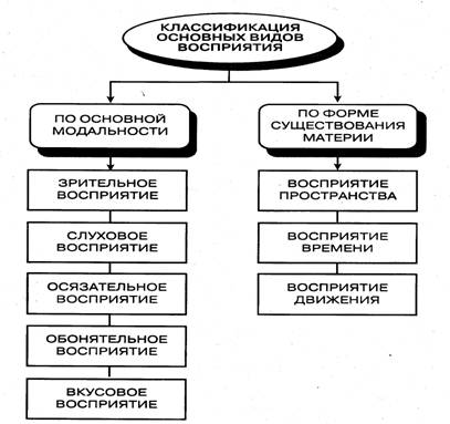 Основой другого типа классификации типов восприятия являются формы существования материи: пространство, время и движение. В соответствии с этой классификацией выделяют восприятие пространства, восприятие времени и восприятие движения [5] .