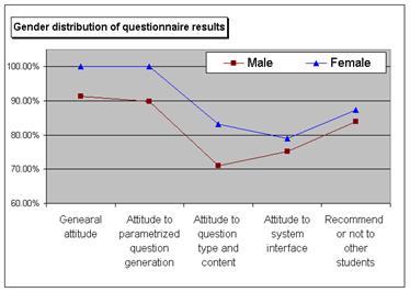 В дополнение к общему анализу мы попытались сравнить отношение к системе для разных групп студентов. На данный момент мы завершили сравнение ответов для групп, выделенных по половому признаку, и получили довольно интересные результаты. На рисунке 3 изображены профили ответов, данные студентами и студентками. Мы подсчитали средние значения для ответов на вопросы, оценивающие основные свойства системы, и выразили их в процентах. 100% означает что все студенты в этой группе дали ответ "очень хорошо". Заметно, что график обозначающий ответы женщин проходит выше "мужского" графика для всех вопросов. Разница достаточно существенна и для некоторых вопросов составляет 10%. В частности, график показывает, что все студенты в женской группе выразили стопроцентно-положительное отношение к системе в целом и к ее способности генерировать параметризуемые вопросы. Этот факт не обусловлен тем, что студентки больше/меньше работали с системой или были более/менее успешны. Данные говорят об обратном: среднее количество вопросов, на которые пытались ответить студенты в течение семестра – 187 для женщин и 178 для мужчин. Разница между средним значением успешности – практически нулевая (37.12% правильных ответов для женщин и 37.26% -для мужчин). Возможной объяснением может быть предположение, что исключительно положительное отношение студенток к системе отражает тот факт, что в течение курса QuizPACK был действительно важным средством обучения для них. Важно и то, что в нашем курсе женщины, традиционно показывающие менее высокие результаты по техническим предметам, нежели мужчины, в итоге получили более высокую среднюю итоговую оценку. Интересно также и то, что даже студентки, получившие в итоге "3", "4-" или ниже, тем не менее высказали свое одобрение системы.