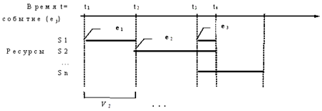 Рассматривая КС как объект изучения, надо иметь ввиду, что компьютерная обработка состоит из процессов, каждый из которых можно представить в виде структуры I = <t, A, T> , где: t - начальный момент возникания процесса; A - дефинирующие атрибуты; T - трасса процесса. Последний компонент формального описания определяет временную последовательность событий e j для обращения данного процесса к елементам системного ресурса S={S1 , S2 , …, Sn }. Последовательность времевых этапов и нагрузка системного ресурса позволяют определить профиль процесса вычисления (рис. 2).