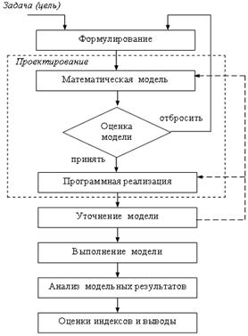 В процессе компьютерного моделирования, независимо от применяемого метода, можно определить обобщенную матодологическую схему модельного исследования (рис. 5). Предложенная формализованная методологическая последовательность предусматривает несколько основных фаз, представленных ниже. В основном, она представляет итерационную процедуру для получения необходимой достоверности разрабатываемой компьютерной модели на базе формулировки начальной модельной гипотезы и ее последовательной модификации. Такой подход является удачным при исследовании сложных систем, а также и при отсуствии достаточной априорной информации для исследуемого обьекта.