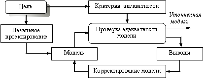 Действия этой стадии предназначенны для полной валидизации проектированной модели и утверждения ее адекватности. Существенное значение для их эффективности имеет оценка текущей адекватности на предыдущих стадиях. В этом смысле процесс уточнения модели надо рассмотривать как совокупность распределенных действий на всех предыдущих стадиях компьютерного моделирования. В общем плане, стадию уточнения можно представить как итеративную процедуру (рис. 6), позволяющую последовательную модификацию начальной версии разрабатываемой модели.
