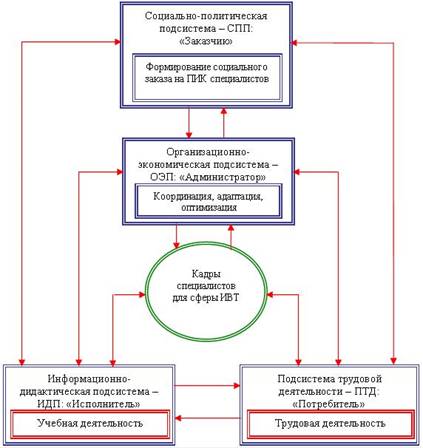 Следующий базовый компонент системы подготовки и использования кадров специалистов для сферы ИВТ определим как подсистему трудовой деятельности – ПТД. Эта подсистема включает в себя всё то, что связано с использованием трудовых ресурсов, подготовка (обучение) которых осуществлялась в рамках информационно-дидактической подсистемы. По отношению к другим компонентам системы ПИК подсистема трудовой деятельности, следовательно, выступает как потребитель кадровых ресурсов, выпускаемых ИДП. Очевидно, что в рамках системы ПИК процессы, протекающие в ПТД, определяются, как минимум, двумя группами факторов. Первая группа связана сферой, предметными областями и объектами трудовой деятельности специалистов, а вторая – это совокупности факторов, определяющие характер и уровень трудовой деятельности специалистов по ИВТ. Процессы, протекающие в ПТД, в общем случае, определяются научно-технической, информационно-технологической, материально-энергетической, организационно-управленческой (административной) и рядом других видов деятельности специалиста. Следует отметить, что с точки зрения системы ПИК подсистема ПТД, интерпретируемая через сферу ИВТ, имеет важное значение не только как комплекс предметных областей и соответствующих совокупностей объектов приложения трудовой деятельности, но и как важнейший компонент системы ПИК специалистов, через посредство которого, по принципу: «практика – критерий истины», осуществляется объективная проверка и оценка в рассматриваемых аспектах качества и эффективности функционирования как СПП, так и ИДП.