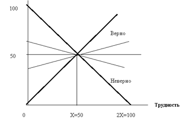 Для пояснения способа предположим, что имеется база заданий, охватывающая проверку знаний в рамках темы (курса). Каждому из заданий приписывается та или иная трудность в принятой шкале, например 0 –100 баллов, разбитой для простоты равномерно на 10 участков: 0-10, 10-20 и т.д. Положим вначале, что задания распределены равномерно на шкале трудности, симметрично относительно центрального значения Х (здесь Х= 50 баллов) и заполняют шкалу протяженностью 2А, а учет трудности производится с точностью до 10. Равномерно означает, что число упражнений в пределах каждого участка примерно одинаково. За каждое правильно выполненное задание испытуемому начисляется число баллов, равное трудности задания. За неверное решение – сбрасывается число, дополняющее трудность до 100 баллов. Таким способом учитывается положение: ошибка штрафуется тем выше, чем легче задание и, напротив, тем меньше, чем задание труднее. На рис. 2 показаны две утолщенные перекрещивающиеся опорные прямые, одна из которых соответствует правильным ответам (Верно), другая – неверным (Неверно). Для рассматриваемого частного случая уравнения прямых таковы: