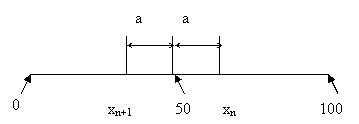 Задания предъявляются контролируемому лицу в следующем порядке. На каждом нечетном шаге участке А, расположенным, например, справа от значения Х датчиком случайных чисел задания выбирается задание с некоторой случайной трудностью. На каждом четном шаге трудность задания выбирается автоматически симметрично (зеркально) относительно значения Х (рис. 3), т.е. в соответствии с уравнением хk+1 = 2Х - хk = 100-хk , где хk трудность нечетного задания (k=1,3,5,…). Использованные задания выбывают из числа предъявлемых в текущем сеансе испытаний.