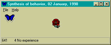 Программа показывает маленький мир, в котором живут бабочка и цветок. Бабочка специально сделана настолько простой, как только я смог себе представить. Она имеет чувства (органы чувств), моторную систему (органы действий) и мозг.