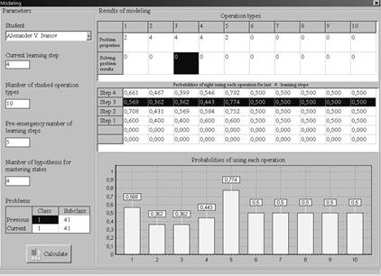 Педагогу наглядно представляются итоги идентификации знаний обучаемого (используется байесовский подход) в цифровой и графической формах, а также тип текущей задачи, которая будет предложена обучаемому для выполнения на следующем шаге обучения в соответствии с его состоянием обученности и заданными значениями параметров модели обучения.