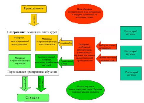 Легко предвидеть, что в будущем, когда репозитории обучения будут достаточно полными, отбор будет возвращать довольно большое количество подходящих деятельности обучения. В этом контексте адаптивные гепермедиа технологии обеспечат дальнейшую адаптацию к индивидуальному студенту. Адаптивная поддержка навигации (такая, как адаптивная аннотация, сортировка и прямое руководство) будет использована для помощи студенту при выборе наиболее подходящих на данный момент понятий в индивидуализированном пространстве обучения. Здесь система будет адаптироваться к уровню знаний студента и индивидуальным стилям обучения. Адаптивная презентация будет использована для адаптивного отображения выбранных понятий. Здесь система будет адаптироваться к уровню знаний и цели обучения. В дополнение, система также позволяет обучаемому искать подходящий учебный материал, используя её собственные критерии, и постоянно добавлять его к модулю. Это производит динамическое и индивидуализированное пространство обучения для каждого модуля курса, где индивидуализация обеспечивается и системой, и студентом (рис. 3).