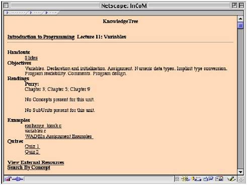 Первая версия портала ДереваЗнаний вместе с серверами WebEx и QuizPАСK и примитивным сервером моделирования студента была запущена осенью 2001 года для курсов структур данных и программирования. Весной 2002 года версия портала 1.5 (рис. 4) и все 4 сервера деятельности были использованы как средство поддержки начального курса в контексте другого курса по программированию. Многие из созданных для первого курса деятельности были повторно применены во втором курсе и мы поняли насколько легко собрать курс из деятельности повторного применения. Студенты использовали систему и её компоненты каждый день. Все компоненты системы были формально оценены и получили положительные отзывы от студентов.