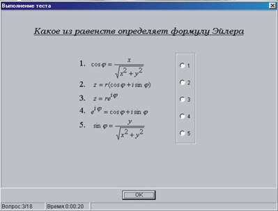 Учащемуся необходимо определить формулу Эйлера из пяти предложенных. Ответить следует «флажком» на соответствующем номере, после чего нажатием клавиши «ОК» совершается переход к следующему вопросу.