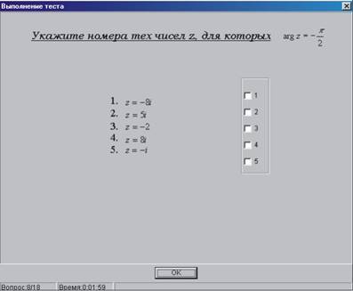 Ответить на данный вопрос следует установкой двух (номера 1 и 5) «флажков». Проверяются знания основных понятий о комплексных числах.