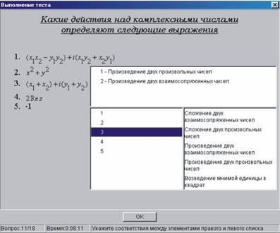 Вниманию испытуемого представлены пять выражений (на сером фоне), определяющих различные действия над комплексными числами. Таблица (белый фон) содержит два столбца (множества), в первом из которых перечислены номера данных выражений, во втором – действия над комплексными числами. Необходимо определить все пять пар соответствия. Левой клавишей мыши производим попеременное нажатие в левое – правое поля, при этом в горизонтальном поле отображаются определившиеся соответствия.