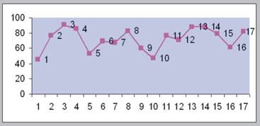 Анализ результатов тестирования и расчет среднестатистических тестовых показателей позволил выявить наиболее сложные, неясно сформулированные или слишком простые задания. Это привело к необходимости изменения содержания или формы представления тестовых заданий, а также к решению вопроса о нецелесообразности включения отдельных заданий в тест. Так, например, на графике (Рис. 6) мы видим номера тех тестовых заданий (1, 5, 10), на которые дано минимальное количество правильных ответов в теме «Комплексные числа».
