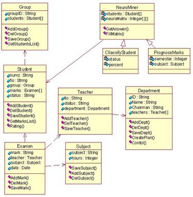 Базовой методологией при построении системы управления Университетом является объектно-ориентированная технология, позволяющая эффективно реализовать ее функциональные возможности. В качестве примера реализации на рисунке 2 приведен фрагмент диаграммы классов для варианта использования "Студенты и успеваемость".
