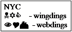3. Юмор является не только более гибким и семантически богатым, но и более образно-насыщенным способом отреагирования критического события, подтверждением чему могут служить достаточно многочисленные анекдоты, предлагающие перевести аббревиатуру NYC (NewYorkCity) в шрифты wingdings или webdings (MSWord) – см. рисунок. Таким образом, можно утверждать, что помимо изучения защитных механизмов личности и невротических реакций, юмор может служить инструментом анализа этнического бессознательного (см. Солдатова, 1998). Отмечаемые неоднократные воспроизведения некоторых анекдотов, например «В Нью-Йорке закончились съемки фильма «Брат-3» (более ста раз за неделю 12-18.09.2001). Съемочная группа приносит извинения за неудобства» могут указывать не только на популярность определенных киногероев и общественных персонажей, но на их роль в общественном сознании – роль современных рыцарей, или обобщенных идеальных образов представителя некоторого этноса. Это особенно актуально, учитывая, что авторов и активных пользователей по терминологии Л.Н. Гумилева можно отнести к пассионариям, центрам активности этноса. Хотя, возможно, речь идет просто о наиболее универсальных средствах отреагирования стресса, безотносительно к этнопсихологической проблематике. Выяснению этого предположения мы планируем посвятить отдельное исследование.