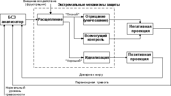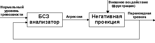 В первом приближении параноидно-шизоидная позиция - это период параноидных тревог и шизоидных защит.[8] Новорожденный младенец периодически испытывает стресс и сильнейший дискомфорт, который он переживает как нападение на себя, как агрессивное преследование со стороны внешнего мира. И в дальнейшем любое неудовлетворение потребностей, любая фрустрация переживается им как нападение извне и вызывает в нем ответную агрессию. Переживание чередования то доверия к миру, удовлетворяющему потребности, то параноидной тревоги и агрессии по отношению к преследующим объектам, Мелани Кляйн трактует как взаимовлияние Эроса и Танатоса, либидо и влечения к смерти. Доверие к миру модифицирует тревогу преследования; от характера этой модификации и будет зависеть дальнейшая судьба человека. Уменьшение параноидной тревоги можно рассматривать как количественную проблему, описываемую в терминах обратной связи.[9] Согласно этому методу, система обладает обратной связью, если она активно реагирует не только на сигналы внешнего мира, но и на сигналы об изменении своего собственного внутреннего состояния. Или, выражаясь более технично, если управляющее воздействие на систему формируется как функция ее выходного сигнала. В общем виде это может звучать несколько туманно; но в каждом отдельном случае все выглядит довольно понятно. Рассмотрим схему активизации тревоги преследования у младенца в параноидно-шизоидной позиции (рисунок 15):