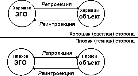 Младенец испытывает воздействие внешнего мира, воспринимаемое им как фрустрация или удовлетворение. В случае фрустрации он, боясь разрушить любимый объект собственной агрессией, применяет экстремальные механизмы защиты, главным из которых является расщепление. Разделив первичный объект на «плохой» и «хороший», младенец фантазийно расправляется с плохим, применяя для этого два дополнительных механизма защиты - отрицание (т.е. фантазийное уничтожение) и всемогущий контроль (т.е. фантазийное управление угрожающим объектом). Проекция этих эмоций на плохой объект порождает параноидную тревогу. Хороший объект, напротив, идеализируется младенцем; позитивная проекция любви к нему вызывает доверие и к объекту, и ко всему внешнему миру. Постепенное накопление кредита доверия к миру позволяет преодолевать тревогу, а, следовательно, и собственную агрессию; на следующей стадии меняется как характер тревоги, так и характер используемых защит. В депрессивной позиции, длящейся примерно с трех до шести месяцев, расщепление перестает быть деструктивно патологическим. Младенец начинает, наконец, воспринимать мать, как целостный объект, к которому он испытывает амбивалентные чувства. Он начинает понимать, что своей ненавистью и агрессией он причиняет вред не просто враждебному плохому объекту, но своей любимой матери, и это вызывает у него депрессивную тревогу, тревогу вины и сожаления. Одновременно с этим он испытывает стремление к репарации, к восстановлению поврежденного объекта. Трудности в прохождении этой позиции депрессивных тревог и маниакальных защит, как можно догадаться из названия, закладывают фундамент маниакально-депрессивных психозов; но это уже проблема отношений с целостным объектом. А нас сейчас интересует период, когда острая параноидная тревога делает невозможной интеграцию расщепленных частей объекта в целостный образ. Почему мы так подробно это обсуждаем? Дело в том, что сформировать личность, сконструировать Эго и Супер-Эго, психика младенца может лишь одним способом, а именно - в бесконечных актах идентификаций, в непрерывном потоке взаимосвязанных проекций и интроекций, репроекций и реинтроекций. А идентификация с расщепленным объектом неизбежно ведет к формированию расщепленного Эго и расщепленного Супер-Эго, к формированию светлой и темной сторон личности (рисунок 17):