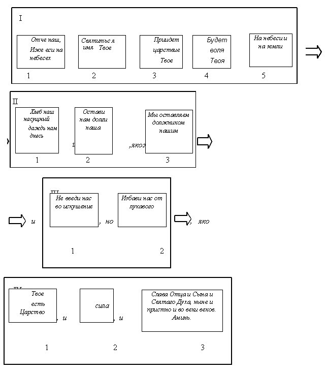 3). Временнуе внушение [1] «... ныне и присно и во веки веков. Аминь», усиливает все предыдущие моменты и передает состояние надежности и уверенности в будущем.