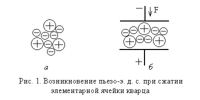 На рис. 1, а показана структура элементарной ячейки кварца, состоящей из 3х молекул диоксида кремния. При отсутствии деформации центр тяжести положительных и отрицательных ионов совпадает (плюсом отмечены ионы кремния, минусом – кислорода). Сжатие кристалла в вертикальном направлении (рис. 1, б ) приводит к смещению положительных ионов вниз, а отрицательных вверх. Соответственно, на наружных электродах появляется разность потенциалов. Рассмотренное явление называют прямым пьезоэлектрическим эффектом . Существует и обратный пьезоэффект, когда под действием приложенного напряжения и в зависимости от его полярности пьезокристалл (кварц, сегнетова соль, турмалин и др.) поляризуется и изменяет свои геометрические размеры. Если же к пьезокристаллу приложить переменное напряжение, то в нем возбуждаются механические колебания определенной частоты, зависящей от размеров кристалла.