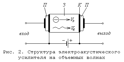 Одним из основных приборов акустоэлектроники является электроакустический усилитель (ЭАУ). На рис. 2 показана схема такого усилителя на объемных волнах. На торцах полупроводникового звукопровода (З) расположены пьезоэлектрические преобразователи (П), которые с помощью омических контактов (К) присоединены с одной стороны к звукопроводу, а с другой – к входным и выходным клеммам. При подаче на вход переменного напряжения во входном пьезопреобразователе возбуждается акустическая волна, которая распространяется по звукопроводу. Взаимодействие волны с движущимися в том же направлении по полупроводниковому звукопроводу электронами обеспечивает ее усиление. Рассмотрим это явление. Предположим, что в звукопровод вводится гармоническая продольная акустическая волна, движущаяся со скоростью Vв . Давление в кристалле при этом от точки к точке меняется. В тех местах, где кристалл сжимается, пьезо-э. д. с. замедляет движение электронов, а в тех местах, где растягивается, – ускоряет. В результате этого в начале каждого периода волны образуются сгустки электронов. При Vэ > Vв сгустки движутся в тормозящих участках волны и передают ей свою энергию, чем и обеспечивается усиление. Подобные акустоэлектронные усилители могут давать выходную мощность сигнала порядка нескольких ватт, имея полосу пропускания до 300 МГц. Их объем (в микроэлектронном исполнении) не превышает 1 см3 .