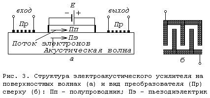 Основным недостатком объемных ЭАУ является сравнительно большая мощность, рассеиваемая в звукопроводе. Более перспективными в этом отношении являются ЭАУ на поверхностных волнах. Структура такого усилителя показана на рис. 3, а . С помощью входного решетчатого преобразователя (рис. 3, б ), напыляемого на поверхность пьезоэлектрического кристалла Пэ , в последнем возбуждается акустическая волна. На некотором участке поверхность пьезокристалла соприкасается с поверхностью полупроводниковой пластины, в которой от источника Е проходит ток. Следовательно, на участке поверхностного контакта пьезокристалла и полупроводника произойдет взаимодействие акустической волны с потоком электронов. Именно на этом участке происходит акустическое усиление сигнала, который затем снимается в виде усиленного переменного напряжения с выходного преобразователя, работающего в режиме обратного пьезоэффекта.