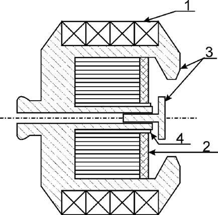 | Рис.1 Источник ионов (ЭРД). 1.-магнитопровод. 2.-анод. 3.-металлическая оболочка-катод. 4.-изолятор. 5.- канал для подвода рабочего вещества. |