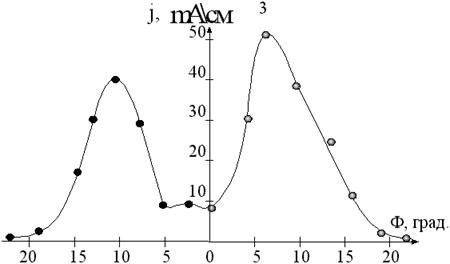 | Рис.5 Зависимость плотности тока пучка ионов от угла. |