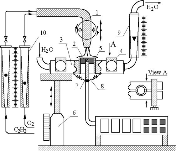 Установка позволяет провести исследования при известных [6-14] условиях синтеза: температура подложки - от 300 до 1500 К; расход газов: 1 - 4 л /мин и их отношение: R = О2 /C2 H2 - до 2.5; расстояние между ядром пламени и подложкой - более 0.5мм. На рис.1 изображены: горелка - 1 (диаметр сопла: 1мм) над поверхностью подложки - 2, помещенной в теплообменник - 3 с зажимами - 4; теплоизолятор - 5 между подложкой и теплообменником, укреплённым на координатнике - 6; термопара - 7 вставлена в тело подложки и поджата пружинами - 8; измерители расхода воды - 9 и газов -10. В качестве материала подложки использовали молибденовые цилиндры (высота 5 и диаметр 10 мм). Спай термопары прижимался к подложке с помощью пружин. Проведенное исследование с помощью теплового датчика показало, что температура поверхности выше температуры подложки в точке измерения не более чем на 17 К при Тп = 900 К, а ошибка в измерении температуры, связанная со способом крепления термопары в молибденовой подложке, не превышает 60К при температуре 900К и определялась по точкам плавления химически чистого олова и меди в качестве реперов в специальном эксперименте.