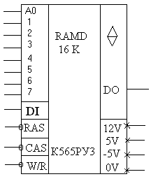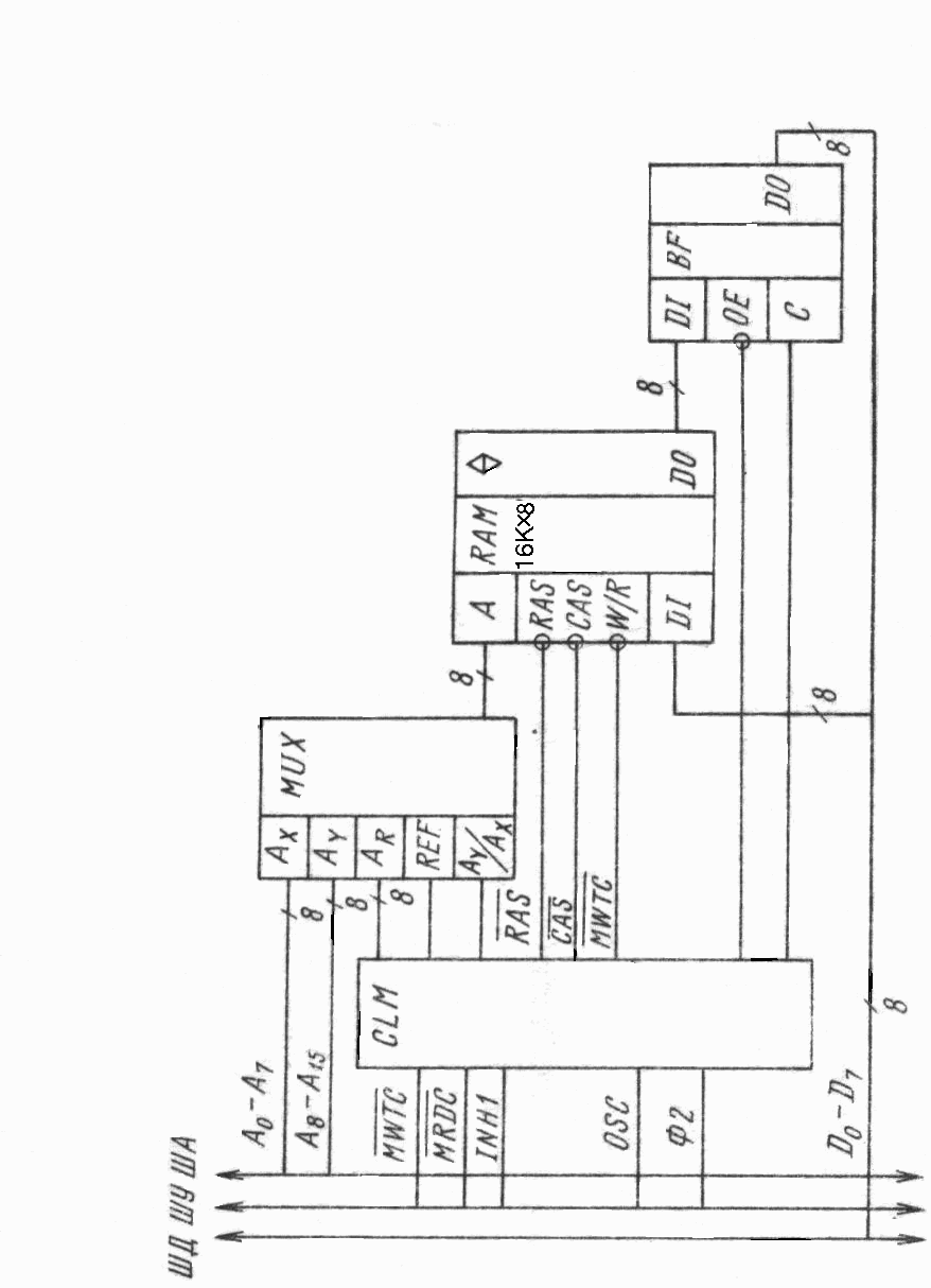 Модуль памяти, обозначаемый как DD1-DD8 на функциональной схеме (приложение 5), построен на микросхемах К565РУ3Г путем соединения их одноименных выводов, кроме информационных. Сигналы RAS и CAS формирует контроллер ОЗУ CLC. , сигнал MWTC с шины управления подан на вход W/R. Для снижения степени рассогласования с ТТЛ управляющими элементами целесообразно подключение всех адресных и управляющих линий ко входам микросхем памяти осуществлять через резисторы с сопративлением 20-30 Ом.
