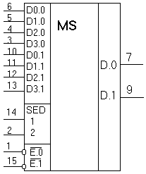 Запрещена передача информации через мультиплексор, когда он находится в невыбранном состоянии (при этом выход находится в состоянии низкого уровня). Каждый из мультиплексоров имеет по четыре информационных входа и свои стробирующие входы Е.0 и Е1. Два аресных входа SED1 и SED2 управляют одновременно двумя мультиплексорами.