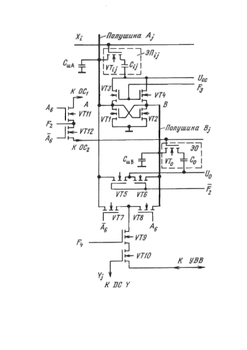 Элемент памяти собран по одно-транзисторной схеме и включает конденсатор Cij. Транзистор выполняет функции ключа: при сигнале на адресной шине строки Xi=1 он открывается и соединяет конденсатор Cij с j-разрядной шиной. Предварительно в паузах между обращениями к накопителю емкости полушин США и СШБ заряжает источник напряжения UO через открытые ключевые транзисторы VT5 и VT6. При обращении к накопителю эти транзисторы закрываются и изолируют полушины Aj и Bj от источника напряжения UО