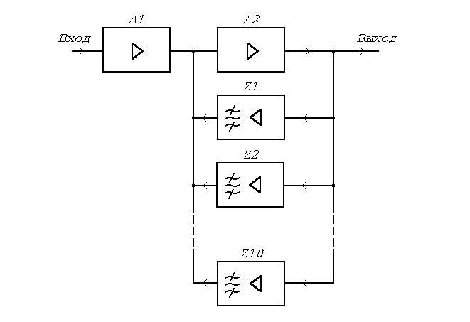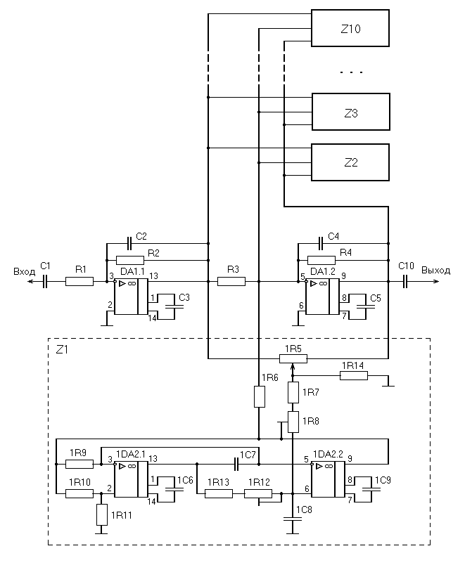 Таким образом, выбрана структурная схема: десятиполосная с фильтрами в цепи обратной связи и буфферным каскадом на входе.
