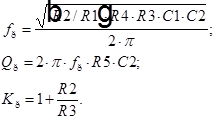 Рассматриваемое схемотехническое построение фильтра позволяет получить оптимальные параметры (необходимое произведение усиления на чувствительность, минимальный шум и максимальный динамический диапазон [3]), в том случае, если емкость С1=С2=С, а сопротивления резисторов равны R0=1/(2·p·fр·С). Резистор R5 обеспечивает требуемую добротность. Его сопротивление определяется выражением [3]: