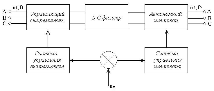 Переменное напряжение питающей сети (рис. 1) выпрямляется с помощью управляющего выпрямителя, фильтруется L-C фильтром и подается на автономный инвертор. Функции регулирования частоты выходного напряжения осуществляет инвертор, а напряжения – выпрямитель. Иногда обе функции осуществляет инвертор, а выпрямитель выполняется неуправляемым.