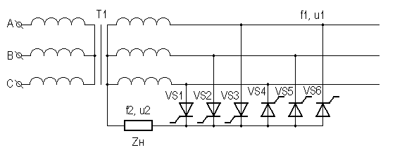 На рис.3 показана схема трехфазно-однофазного преобразователя частоты с непосредственной связью. Преобразователь состоит из двух трехфазных схем выпрямления, первая из которых присоединена к фазам трансформатора анодами тиристоров VS1 – VS3 (гр.I), а вторая – катодами тиристоров VS4 – VS6(гр.II).